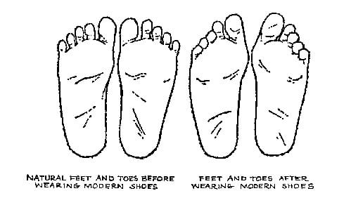Above you can see a visual representation of how your feet are supposed to look like and what they normally look like after wearing modern shoes.